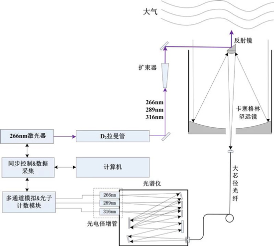 臭氧雷達系應用差分吸收原理,通過高能Nd:YAG激光器發射266nm的紫外脈沖激光,其中一束位于臭氧氣體的吸收線上,另一束位于吸收線之外,組成一對探測波長。266nm激光通過拉曼管后產生289nm、299nm和316nm三個波長激光,266nm和289nm、289nm和299nm、299nm和316nm一共組成3個波長對,分別對應不同的探測高度和探測時間(白天或夜晚)。每一個波長對的其中一個波長位于臭氧吸收較強的位置,而另一個波長位于臭氧吸收很弱或物吸收的位置,利用臭氧對這兩個激光波長的吸收差別(兩種波長光信號的消光比),確定兩個脈沖激光共同路徑上臭氧的濃度,從而實現對臭氧時空分布的探測。