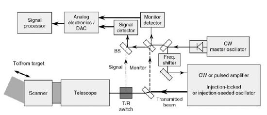 主要原理:單頻窄線寬1550nm激光,通過分束器后分成二束光,一束作為本振光,用于和接收到的回波激光進行光混頻;另外一束通過聲光頻移調制后,形成頻移的脈沖信號光,經過脈沖激光放大器后,產生高能量的脈沖激光通過光學系統發射到空中。光信號探測模塊接收回波激光與種子光分束的本振光,通過混頻效應,轉換成電信號,電信號經過放大、濾波后送往后續信號處理單元,再經過軟件反演算法處理,*終可得到風向、風速等信息、圖像或風場結構。