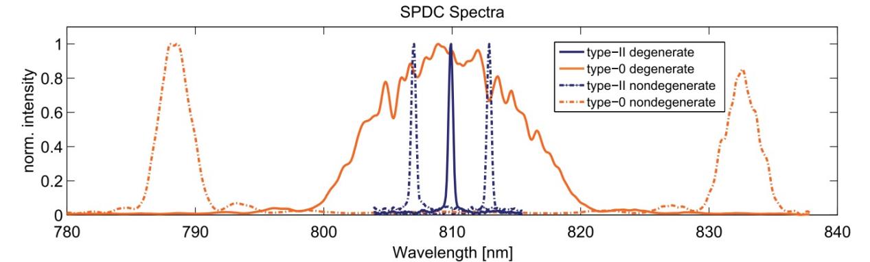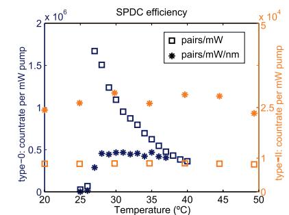 從曲線觀察,II型PPKTP晶體(兩條橙色曲線)的光子對輻射亮度(光子對/每毫瓦泵浦功率)和光子對光譜輻射度(光子對/每毫瓦泵浦功率/nm)與晶體溫度調(diào)節(jié)相關(guān)性不高,而0型PPKTP晶體(兩條藍(lán)色曲線)在簡并輸出中心波長810nm(約26.5 oC時)光子對亮度*高;但是由于此時輻射光譜帶寬很寬(參見圖二);其光子對光譜亮度(光子對/每毫瓦泵浦功率/nm)比較低,隨著溫度調(diào)變(伴隨著非簡并度提升,即輸出光子對信號光和閑散光中心波長差異加大),雖然光子對總亮度稍有減小,但是光譜亮度明顯提升,并在大約28 oC左右大致達(dá)成較為恒定的光子對光譜亮度。