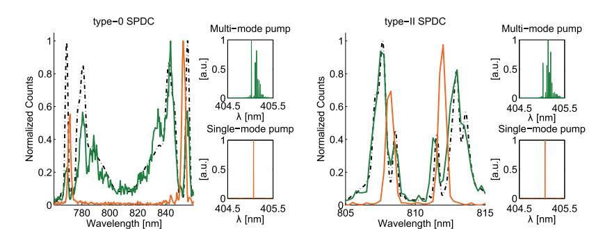 如圖所示,橙色曲線為利用405nm單模(窄線寬)激光泵浦的光子對輻射光譜曲線,綠色為利用405nm多模(寬線寬)激光泵浦后的光子對輻射光譜曲線,很明顯,0型PPKTP采用多模激光激發(fā)后光子輻射譜過寬,為了勉強(qiáng)可用還需要額外附加帶通濾光片做濾波;而II型PPKTP在采用多模激光激發(fā)后線寬漂移和展寬都不大,一般可以直接應(yīng)用,也就是說II型更能適合多模激光泵浦源。