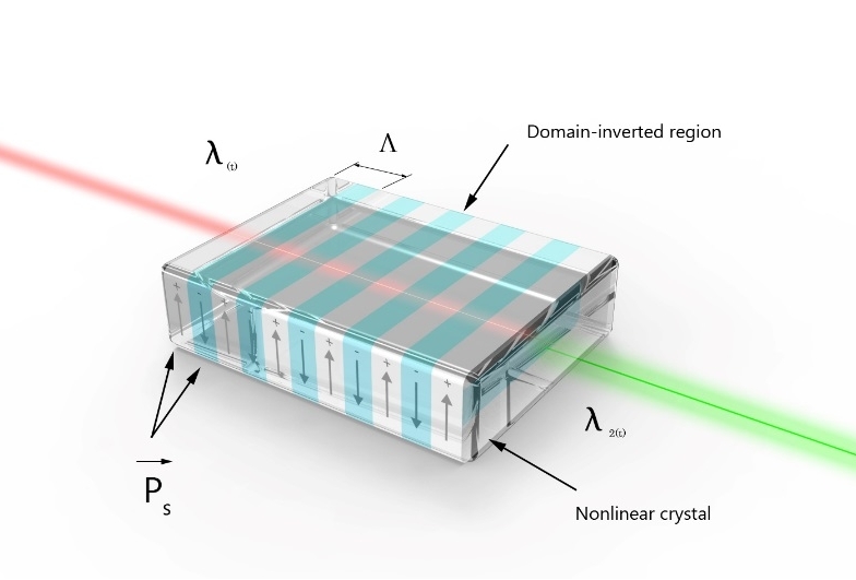 PPKTP其中的PP意思是周期性極化,具體來說是通過施加高壓電場使帶電磁性的晶體特定區(qū)域內(nèi)的極性產(chǎn)生永久性的翻轉(zhuǎn),當(dāng)通過一定的工藝實現(xiàn)了穩(wěn)定性的周期翻轉(zhuǎn)后,就在晶體內(nèi)引入了非線性極化率的周期性的階躍變化,從而可以實現(xiàn)準(zhǔn)相位匹配(QPM : Quasi Phase Matching)。根據(jù)準(zhǔn)相位匹配理論,通過對晶體的非線性極化率的周期性調(diào)制來補償非線性頻率變換過程中因色散引起的基波和諧波之間的波矢失配,可以獲得非線性光學(xué)效應(yīng)的有效增強(qiáng)。