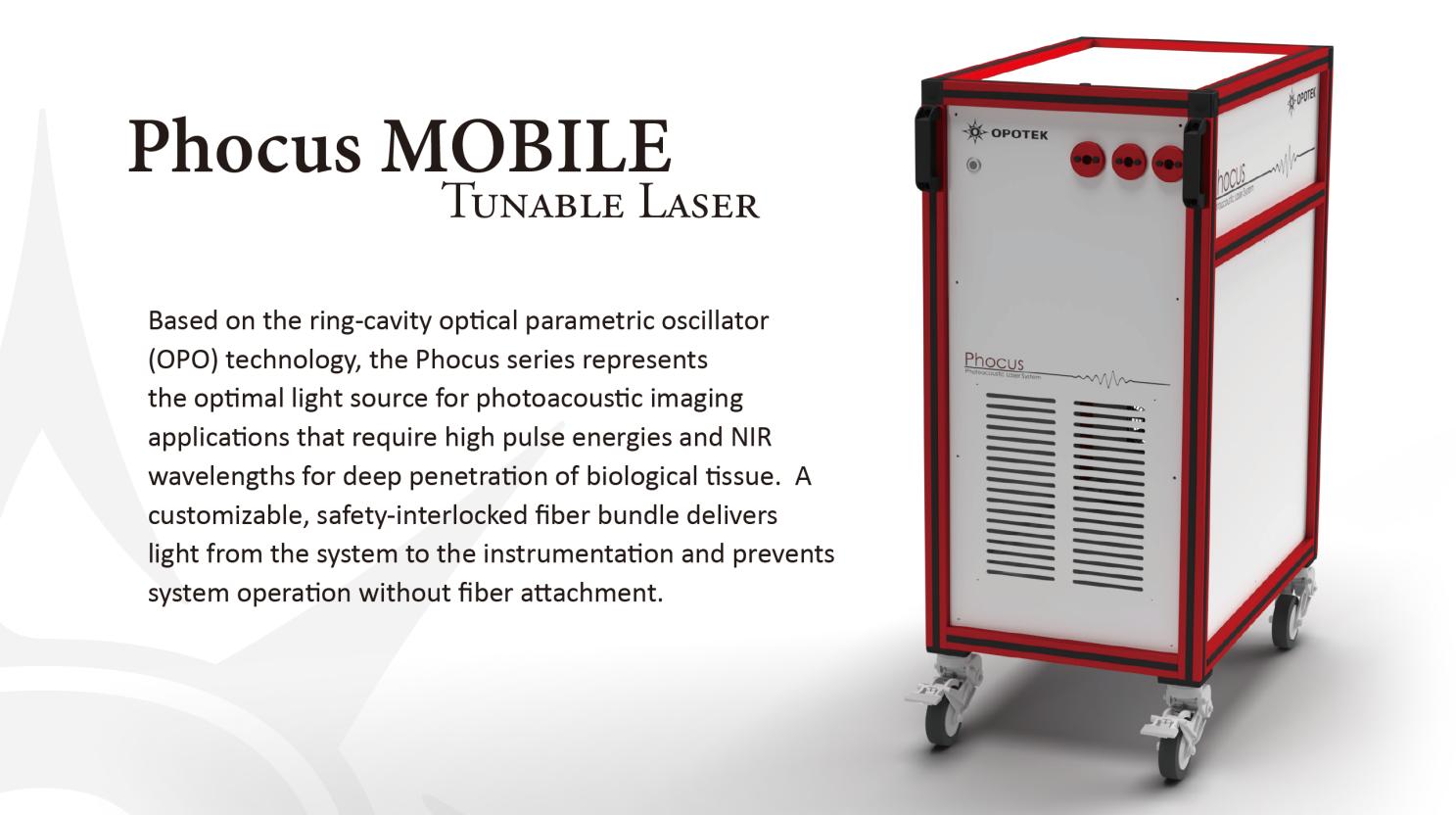 Phocus 為專門為光聲光譜設計的 OPO 激光器。Phocus 采用環形腔、I 類位相匹配,具備較高的近紅外轉換效率,滿足生物組織光聲成像的需求。Phocus Mobile 為一體式可移動高能量光聲光源,具備安全自鎖、光纖輸出等功能,可滿足臨床需求;Phocus Benchtop/ Phocus Inline 則更為適合實驗室使用或系統集成。