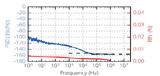 圖 1 是典型的光學(xué) ADC 配置。 要進(jìn)行數(shù)字化的源信號在光學(xué)域中進(jìn)行采樣。這是通過電光調(diào)制器實現(xiàn)的,該調(diào)制器根據(jù)輸入信號相應(yīng)地調(diào)節(jié)來自MENHIR-1550激光器的脈沖強度。脈沖串強度完美地反映了輸入信號, 其在精確和已知的時間被采樣。激光的超短脈沖寬度(<250 fs)確保了即使在快速變化的輸入信號下也能進(jìn)行良好的采樣。提高ADC的性能的關(guān)鍵是減小光孔抖動,即在正確的時間采樣。圖2顯示了MENHIR-1550激光器的時鐘抖動性能。在1 GHz的重復(fù)頻率下,10 kHz至1 MHz的頻率范圍內(nèi)可以實現(xiàn)小于1 fs的時鐘抖動(更高版本可定制)。