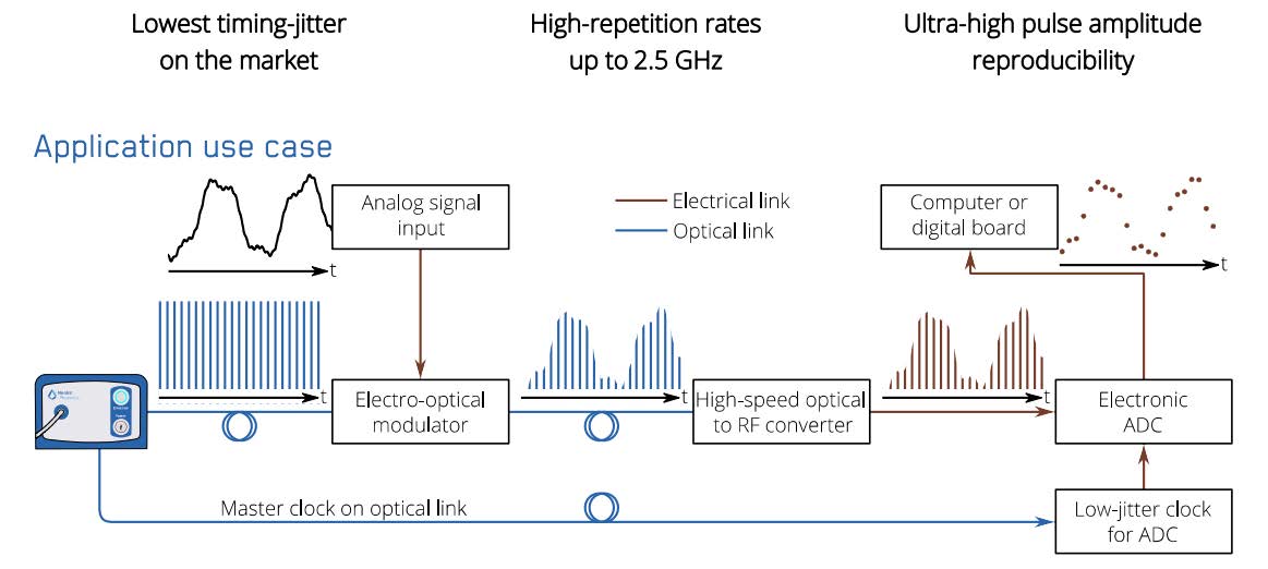 數(shù)據(jù)數(shù)字化為電信、雷達(dá)和信號處理方面帶來了前所未有的機遇。幾乎所有現(xiàn)今使用的傳感系統(tǒng)都需要將模擬信號轉(zhuǎn)換為數(shù)字信號。信號速率增長的速度超過了電子模擬到數(shù)字轉(zhuǎn)換(ADC)的速度。更高帶寬、速度或數(shù)字化精度的需求對于ADC設(shè)置的孔徑抖動提出了嚴(yán)格的要求。改善ADC的一種方法是使用由光子解決方案提供的較低定時抖動時鐘源。光子ADC不僅僅改善了時鐘抖動,使用像MENHIR-1550激光這樣的鎖模激光源可以實現(xiàn)各種新的超快光子數(shù)字化技術(shù)。