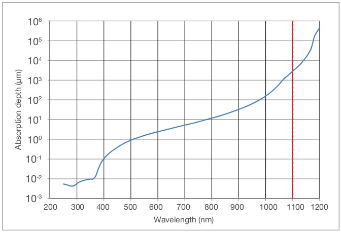 下圖為入射光波長與吸收深度的關系,可以非常容易地得出如上的結論。