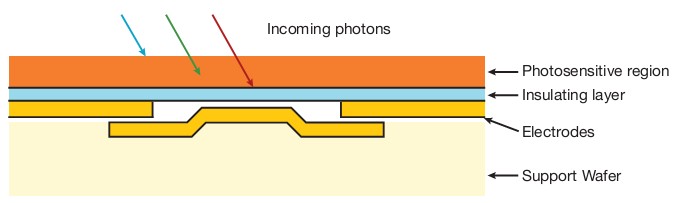 量子效率主要由芯片的光敏硅層吸收光電子的能力所決定,而這層光敏層,亦稱擴散區。僅在該區域中,光子轉化成電子-空穴對,并由電場禁錮在像素中,然后電荷再依序被讀出。