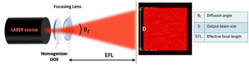 光束勻化器通常以“漫射角(diffusion angle)”來表征準(zhǔn)直光束經(jīng)過器件后的發(fā)散能力。可以選配不同焦距的透鏡來實現(xiàn)不同的投射面積。