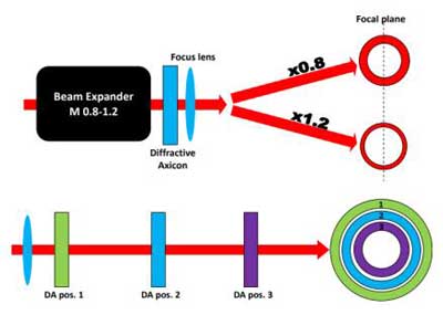 對光束直徑、衍射錐透鏡的位置加以調(diào)整,可實現(xiàn)不同的直徑以及不同的粗細(xì)的環(huán):
