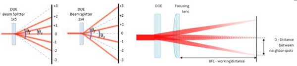 如圖14 (左)所示,多焦點DOE有兩種類型;一種類型集成了聚焦透鏡功能,其焦距、焦點間距是固定的;第二種類型由DOE產(chǎn)生多焦點效應(yīng),而焦距、焦點間距由附加透鏡決定。