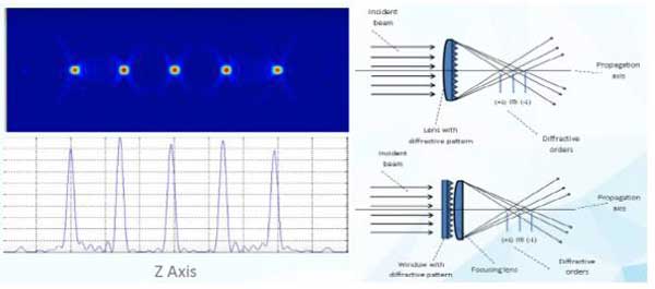 圖14 五焦點衍射元件(左);兩種不同器件的使用方式(右)