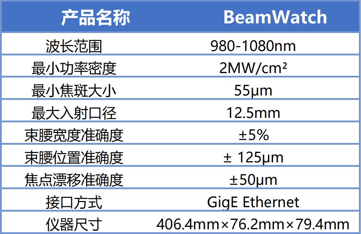MKS-Ophir公司的BeamWatch在線激光光束品質(zhì)分析儀就巧妙的利用了這一點,待測高功率激光焦點落在BeamWatch的中空部分,作用于空氣(或保護氣)產(chǎn)生瑞利散射,然后在側(cè)面利用CCD或CMOS成像器采集瑞利散射的空間強度分布,收集數(shù)據(jù)后,利用自帶的軟件顯示并分析諸多激光參數(shù),包含且不限于: