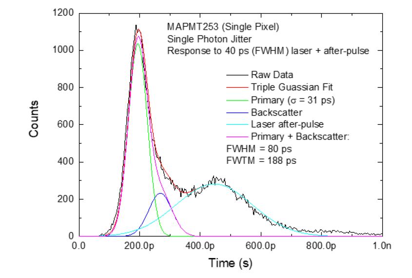 MCP-PMT在單光子計時精度方面有著較好的優勢,其抖動在30皮秒(RMS)以內。我們仍采用8X8的采樣分析。實驗中使用Photek的LPG-650光源。波長在650nm,脈寬40ps(FWHM)。采用LeCroyWavemaster 808Zi-A示波器,測量每個通道。實驗中我們還用到PD010光電二極管來作為參考信號。在對這些曲線進行高斯擬合后,我們得到主峰的半寬度(FWHM)為31皮秒。如圖3所示: