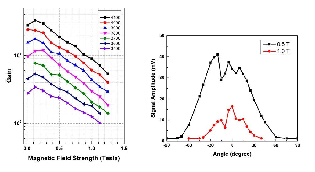 圖6. MAPMT253的磁場敏感性測試,顯示磁場對不同總PMT電壓下增益的影響(左圖)以及磁場角度的影響(右圖),在??4100V下操作,其中0表示與輸入窗口垂直。