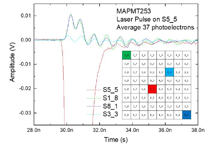MCP-PMT在非常靠近真空封裝(即管壁)的信號接口,經常會受到周邊陽極信號的反射影響。我們通過只針對中心S5_5進行多光子脈沖照射,然后分析不同區域的噪聲影響。如圖5所示: