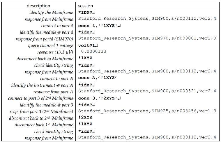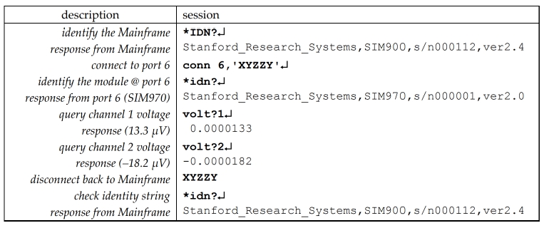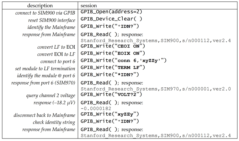 GPIB (IEEE-488)示例是作為偽代碼編寫的,因為沒有類似的GPIB控制臺程序。 發送到SIM系統的實際數據再次設置為 “bold teletype”, 而響應設置為“plain teletype”.