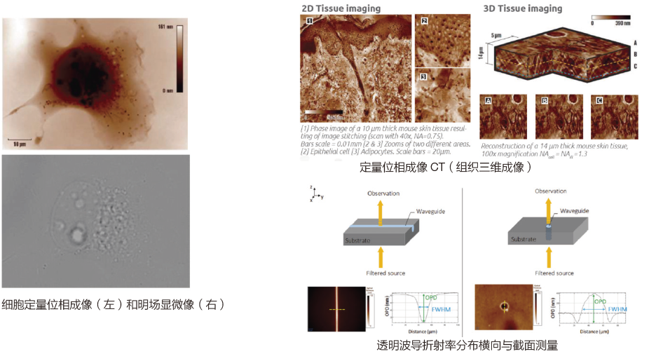 相襯成像是生物領(lǐng)域廣泛使用的技術(shù),可以對(duì)吸收均一但折射率有起伏的樣品進(jìn)行無標(biāo)記成像。有別于傳統(tǒng)的相襯成像(在顯微成像系統(tǒng)中插入位相板)只能展現(xiàn)位相越變邊界處的結(jié)構(gòu),定量位相成像可以高分辨率完整地檢測(cè)樣品位相的細(xì)微變化,充分利用生物細(xì)胞、組織等的相位襯度;同時(shí),還能通過位相變化測(cè)量其他樣品的表面深度、折射率變化等。定量位相成像是一種有非常大潛力的成像技術(shù)。