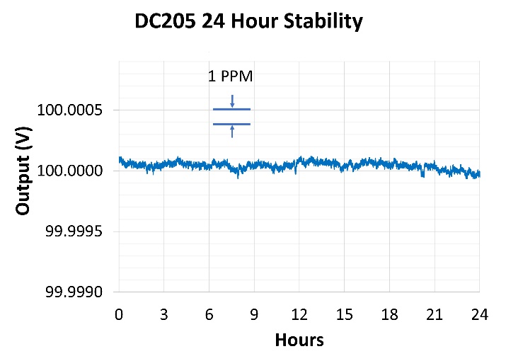 DC205 具有出色的噪聲特性——在 1 V 范圍內,rms 噪聲小于 1 µV(0.1 Hz 至 10 Hz)。它在一年內的精度也達到 0.0025 %,并且具有出色的溫度穩定性,規格小于 1 ppm/°C。