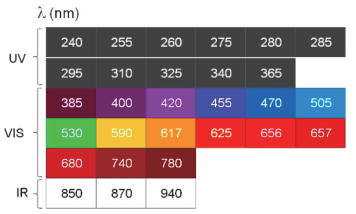 下圖所示為目前 Mightex 可提供的 LED 波長 :