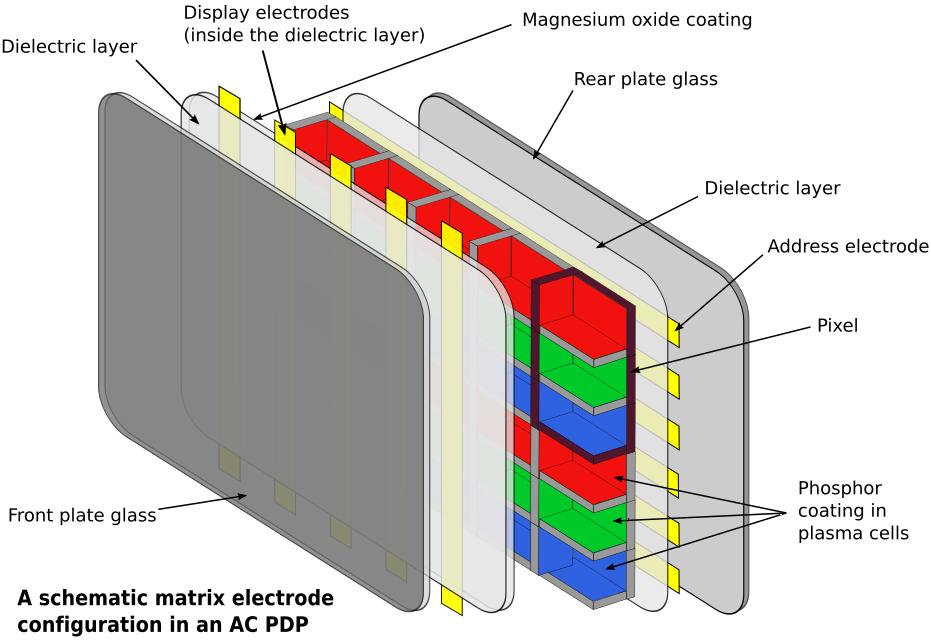 PDP是一種利用氣體放電的顯示裝置,這種屏幕采用了等離子管作為發光元件。它的黑色深,對比度高,響應快,視角大,普通光照環境下可視性好,輕薄,這使得它和CRT顯示屏相比具有更高的技術優勢。