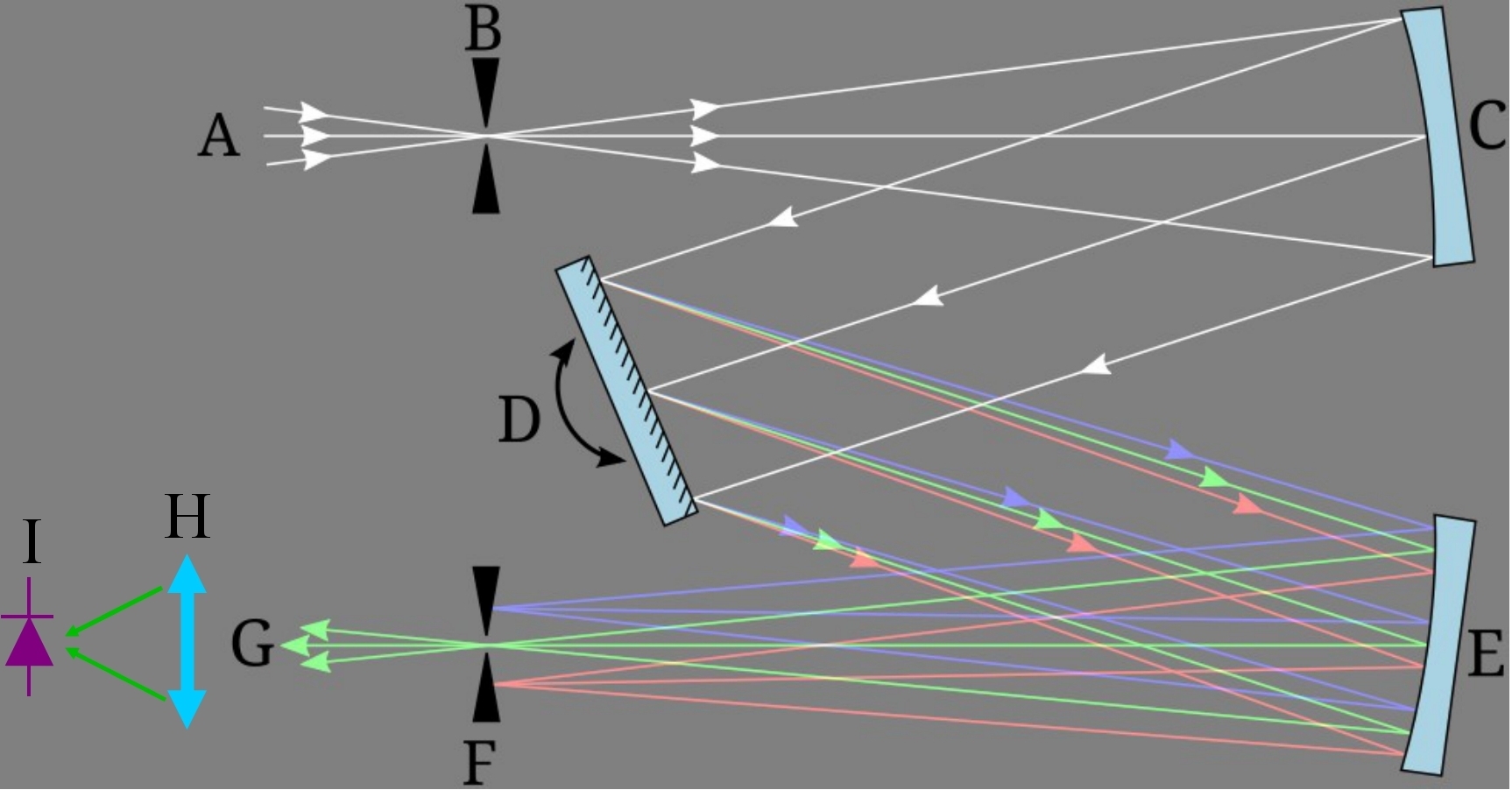 E為匯聚鏡,F(xiàn)為出射光學(xué)狹縫,G為出射光,H為匯聚鏡,I為探測(cè)器。
