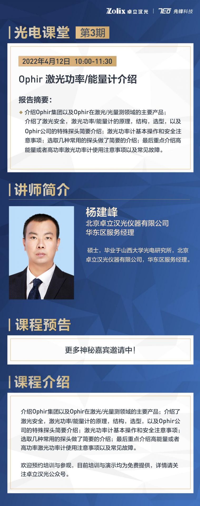 為多方位展現光電儀器研制領域的最新成果,使客戶進一步了解和熟悉光電產品及應用,卓立漢光&先鋒科技秉持“優質服務”的理念,特別策劃制作《光電課堂》網絡專題直播課。歡迎預約培訓與參觀,目前培訓與演示均為免費提供,詳情請關注先鋒科技公眾號。