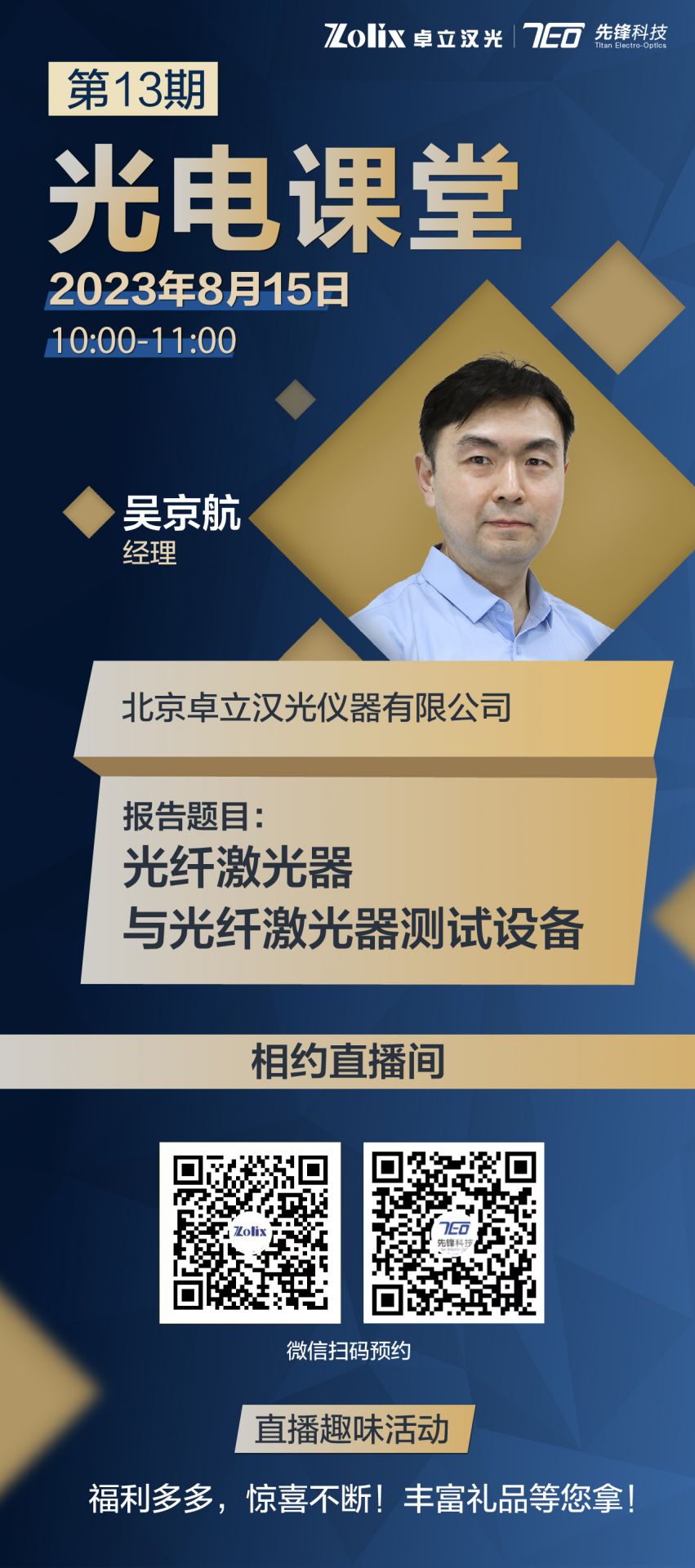 8月15日上午10:00—11:00北京卓立漢光儀器有限公司 業(yè)務(wù)發(fā)展部—吳京航經(jīng)理將為我們帶來光纖激光器與光纖激光器測試設(shè)備的介紹,分享最近十年蓬勃發(fā)展的光纖激光器的技術(shù)特點,以及我司代理光纖激光器與光纖激光器測試設(shè)備。直播期間更有豐富好禮相送,歡迎屆時參加!