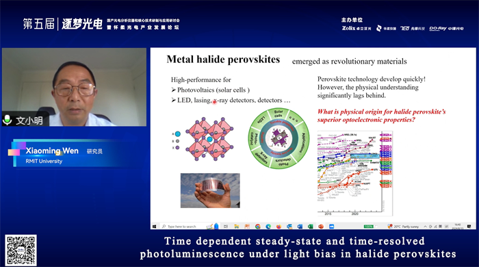 遠在澳大利亞皇家墨爾本理工大學的文小明研究員通過國際直播平臺,為國內外科研工作者做Time dependent steady-state and time-resolved photoluminescence under light bias in halide perovskites英文報告,文老師首先介紹了穩態光致發光 (PL) 和時間分辨光致發光 (TRPL) 技術發展現狀。然而,當對表現出光照誘導的 PL 光譜、效率和壽命變化的材料(如鹵化物鈣鈦礦)進行測量時,這些技術面臨一些問題。在過去十年中,鹵化物鈣鈦礦因其優異的光電特性和出色的器件性能(如高效太陽能電池、光電探測器和 LED)而引起了極大的研究興趣。使用標準 PL/TRPL 測量時,可能會忽略和遺漏關鍵信息,并可能導致誤解。本次報告文老師重點介紹一些光照誘導 PL 效率和載流子壽命增加的應用案例。使用專門設計的時間相關 PL/TRPL,有/沒有光照偏置,進行探索異常的光電特性,并利用其團隊*近提出的晶格能量庫理論對該現象做了很好地解釋。文老師作為卓立漢光產品的使用者,也在演講中感謝卓立漢光的協助,其團隊在RIMT大學定制了多功能PL-TRPL光譜系統,該系統能夠完成上述大部分功能,并且功能大大擴展,包括激發、檢測范圍。可以預期該系統將能為其團隊的光物理研究提供重要的技術支持。