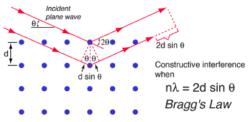 布拉格定律:當X射線束的入射角滿足晶面間X射線路徑長度的差值為波長的整數(shù)倍時,就會發(fā)生相長干涉,產(chǎn)生衍射光束