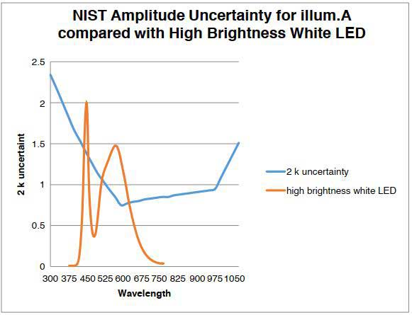 這造成在使用A光源作為校準源時產(chǎn)生不確定性。 大多數(shù)設(shè)備都以A光源為參考,但是典型的非A光源的光源的測量不確定性相對較高,并且儀器間一致性也會受到影響。 因此,大多數(shù)電子顯示測量都不是基于A光源的。