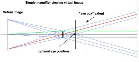 上面的這個眼盒(eye box)例子是一個簡單的放大鏡,真實物體放在鏡頭焦平面的前面。光線軌跡顯示虛擬圖像是在真實物體后面形成的。必須執(zhí)行第二次光軌跡,才能知道觀察者將如何看到圖像的。