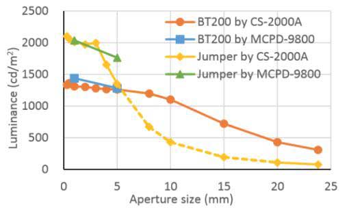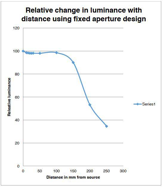 Photo Research的固定孔徑附件在測量設(shè)備的較大運動范圍內(nèi)可以變化很小。 當被測光源不再充滿透鏡的入射光瞳時,測得亮度會快速變化。但經(jīng)過校準在2-6mm的孔徑之間,亮度幾乎沒有變化。