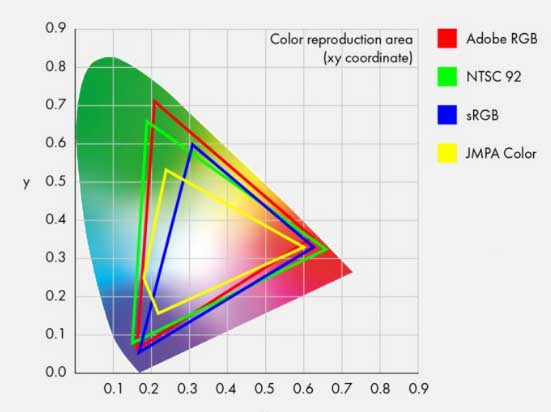 色域(Color Gamut),就是指某顯示設(shè)備所能表達的顏色數(shù)量所構(gòu)成的范圍區(qū)域。為了能夠直觀地表示色域這一概念,國際照明委員會(CIE)制定了一個用于描述色域的方法:CIE-xy色度圖。 在這個坐標(biāo)系中,各種顯示設(shè)備能表現(xiàn)的色域范圍用RGB三點連線組成的三角形區(qū)域來表示。 在此區(qū)域內(nèi),設(shè)備顯示區(qū)域的三角形的面積越大,就表示該設(shè)備的色域范圍越大。