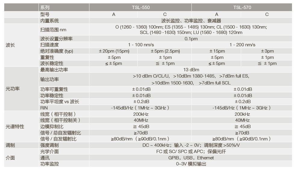 Santec TSL 分為5 系列和7 系列。其中5 系列分為A、C 兩個級別,又按照波段范圍分為O(1260~1350nm)、ES(1355~1485nm)、CL(1500~1630nm)、SCL(1480~1630nm)、LU(1560~1680nm)多個型號;7 系列性能更高,主要針對CL、SCL 波段。