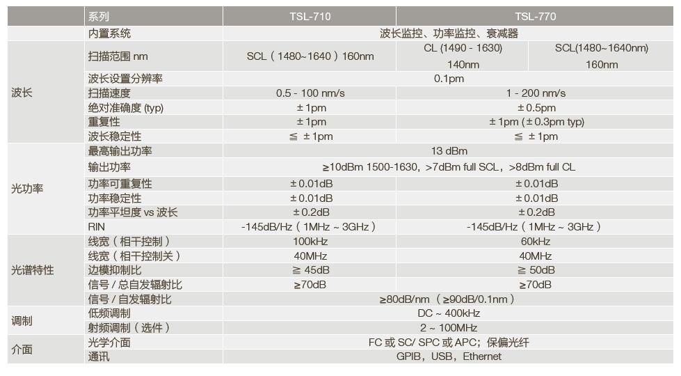 連續掃頻窄線寬激光器是Santec 公司的拳頭產品。采用Littrow 架構的ECDL,可 實現通訊波段單縱模<100kHz 線寬的輸出,13dBm 功率,無跳模掃頻范圍達到100nm,每秒可掃描200nm。Santec TSL 分為5 系列和7 系列。其中5 系列分為A、C 兩個級別,又按照波段范圍分為O(1260~1350nm)、ES(1355~1485nm)、CL(1500~1630nm)、SCL(1480~1630nm)、LU(1560~1680nm)多個型號;7 系列性能更高,主要針對CL、SCL 波段。