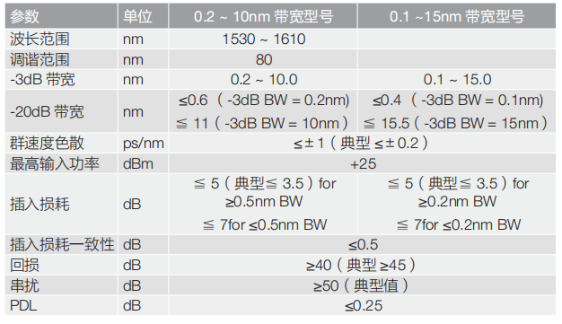 OTF-350平頂型手動波長可調(diào)諧光濾波器性能: