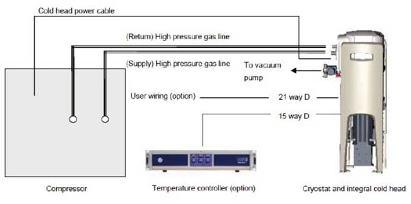 主要工作原理:Optistat Dry 干式制冷機采用GM 制冷機,主要部件有冷頭、壓縮機以及高壓氦氣管。這三個部件組成了一個閉合的氦氣循環(huán)回路,可以產(chǎn)生制冷功率。冷頭是GM 制冷機循環(huán)的場所,通過兩根高壓氦氣管以及供電引線連接到壓縮機。其中一根高壓氦氣管供給高壓氦氣,另一根回收膨脹后的低壓氦氣。壓縮機提供必需的高壓氦氣流量來提供足夠的制冷功率。