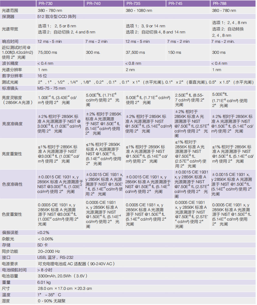 Photo Research 公司擁有幾十年的光度計生產制造經驗,并推出超靈 敏光譜測試系統 - 制冷型號探測器 PR-730/735 和 PR-740/745 , PR- 788 光譜式光度色度輻射度計。PR-730 和 PR-740, PR-788 覆蓋可見光譜,從 380nm 到 780nm, 而 PR-735 和 PR-745 覆蓋 380nm 到 1080nm 可見光到近紅外光譜波段,是針對近紅外輻射度測試的最佳方案。PR-788 具有業界領先的 1000000:1 的動態范圍,它提供了在 不必增加外部衰減或改變幾何光學(例如測量場地尺寸)的情況下, 即可從黑到全白測試設備輸出的解決方案。