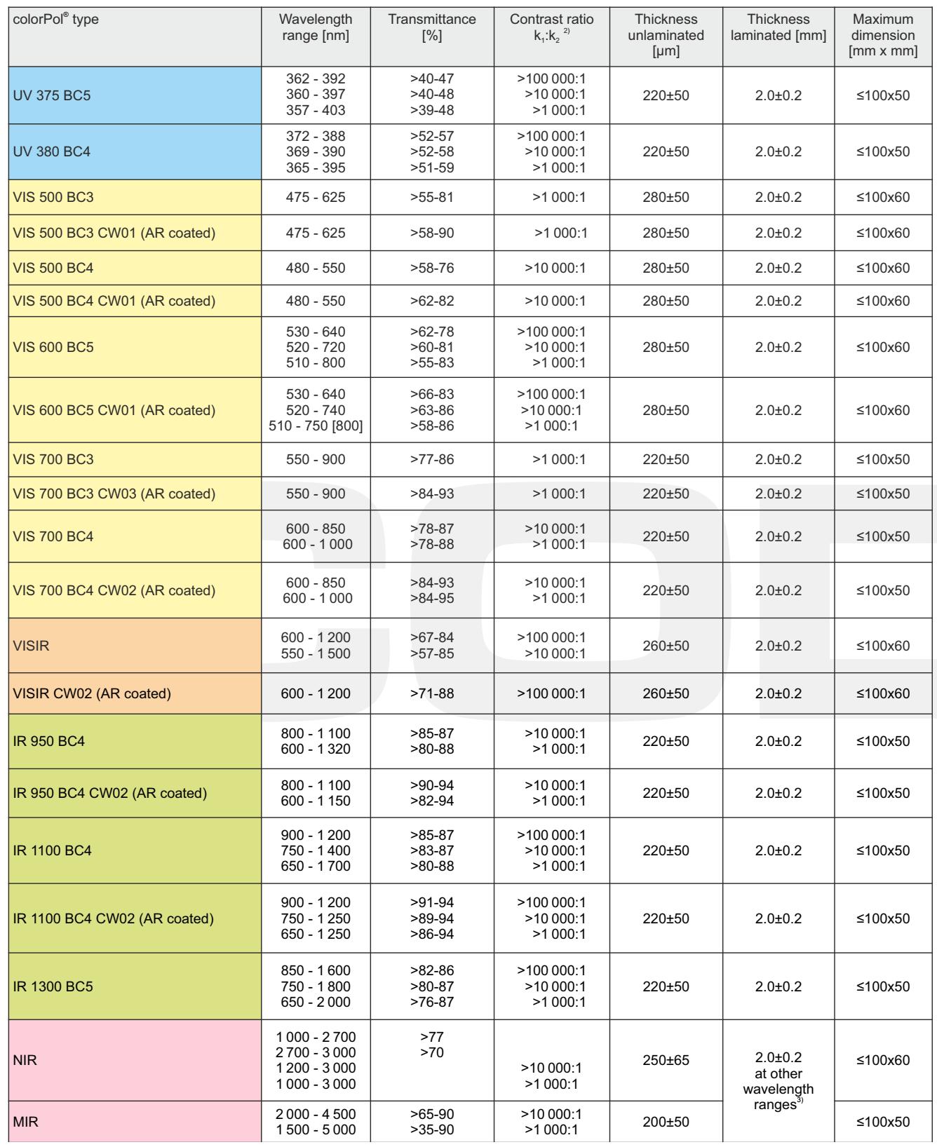 colorPol® 偏振片選型表