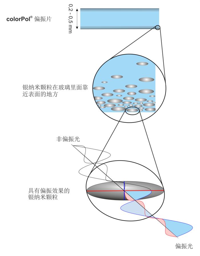 通過CODIXX的特殊制造技術,可以精準確定銀納米顆粒的大小、密度和方向。橢圓形的幾何形狀產生偏振特性所需的一個長軸和一個短軸。它們根據波長吸收光的所有橫波,僅允許沿對稱軸方向的光波通過。所有納米顆粒的分布必須絕對平行,以產生完美的線偏振光。